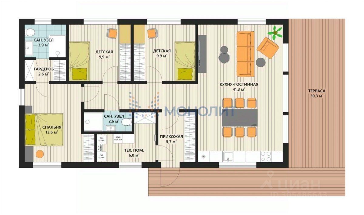 Площадь дома 135 м2 - 2 детские, 1 мастер-спальня с гардеробной и душевой, отдельный сан/узел, просторная кухня-гостинная 41,3 м, большая терраса площадью 40 м2! Идеальный вариант для загородной жизни!