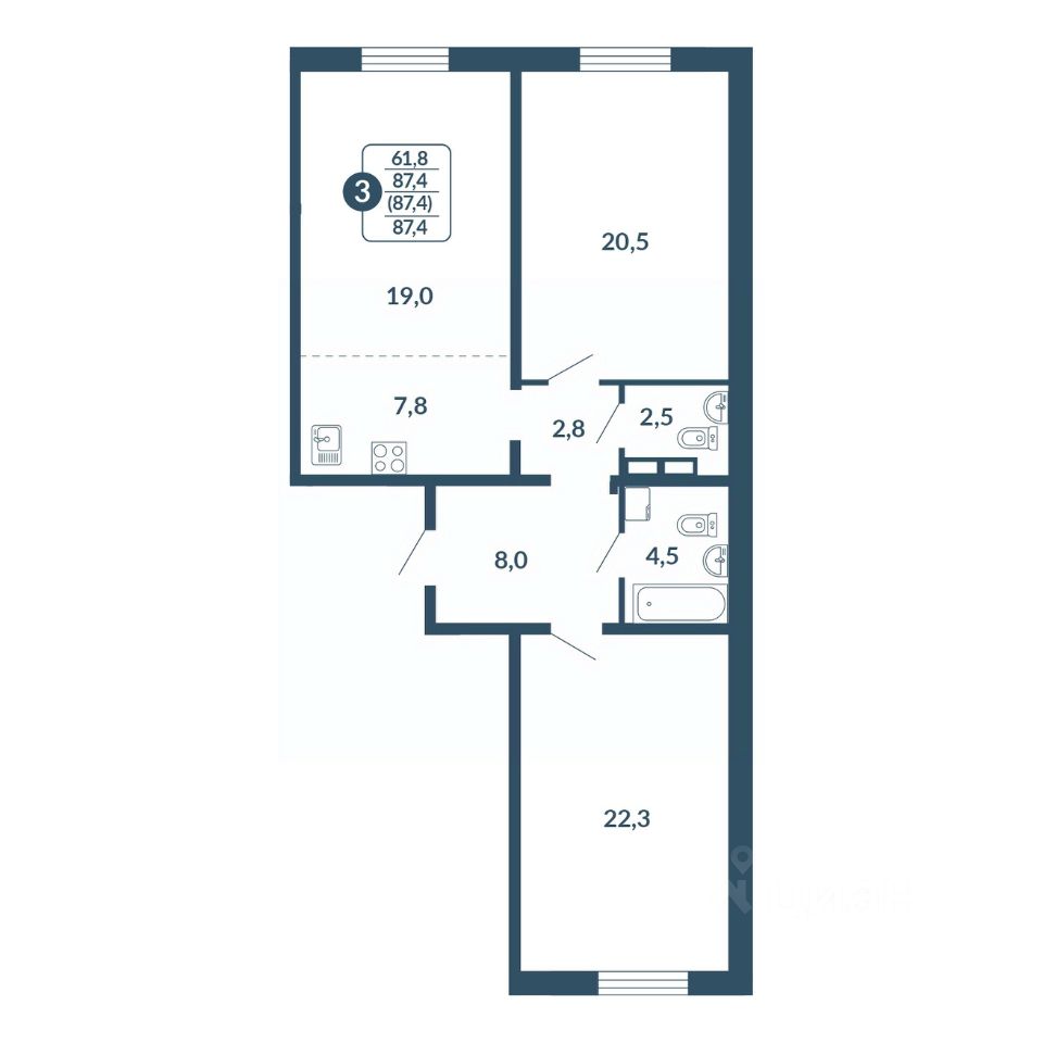 Общая площадь87,4 м2