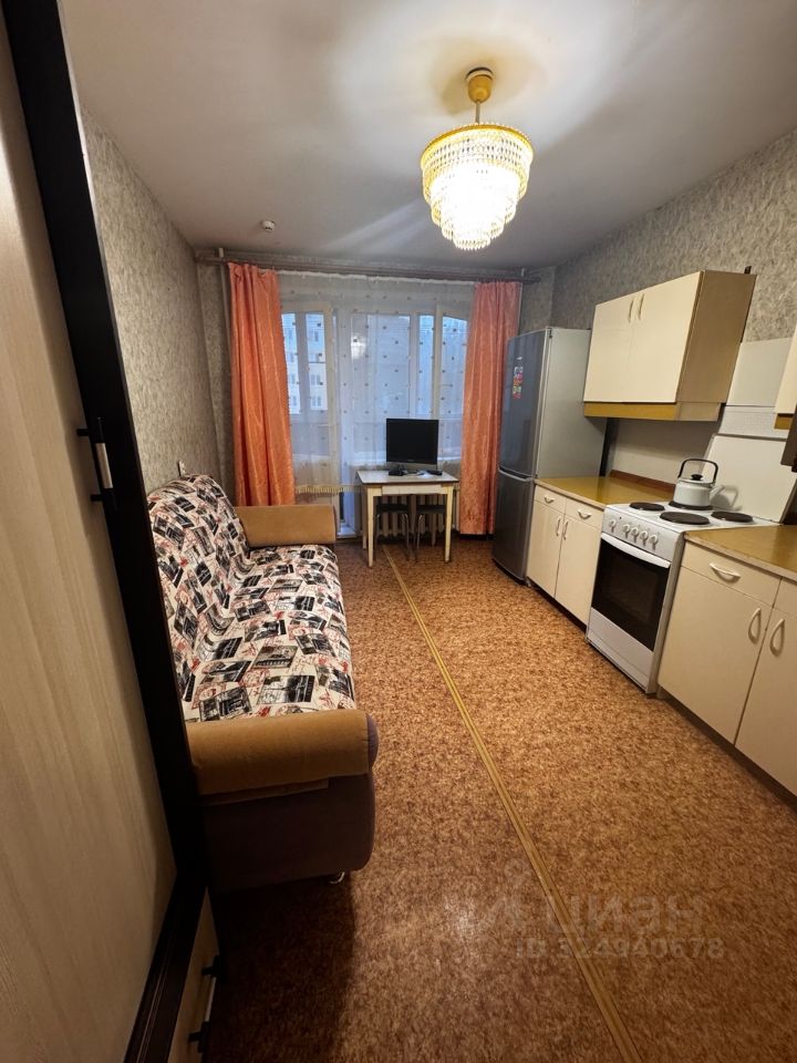 В квартире имеется диван, стиральная машина, телевизор, электрическая плита, посуда.