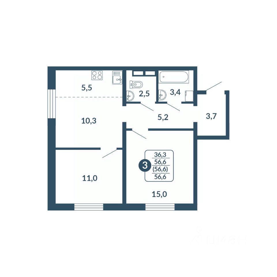 Общая площадь56,6 м2